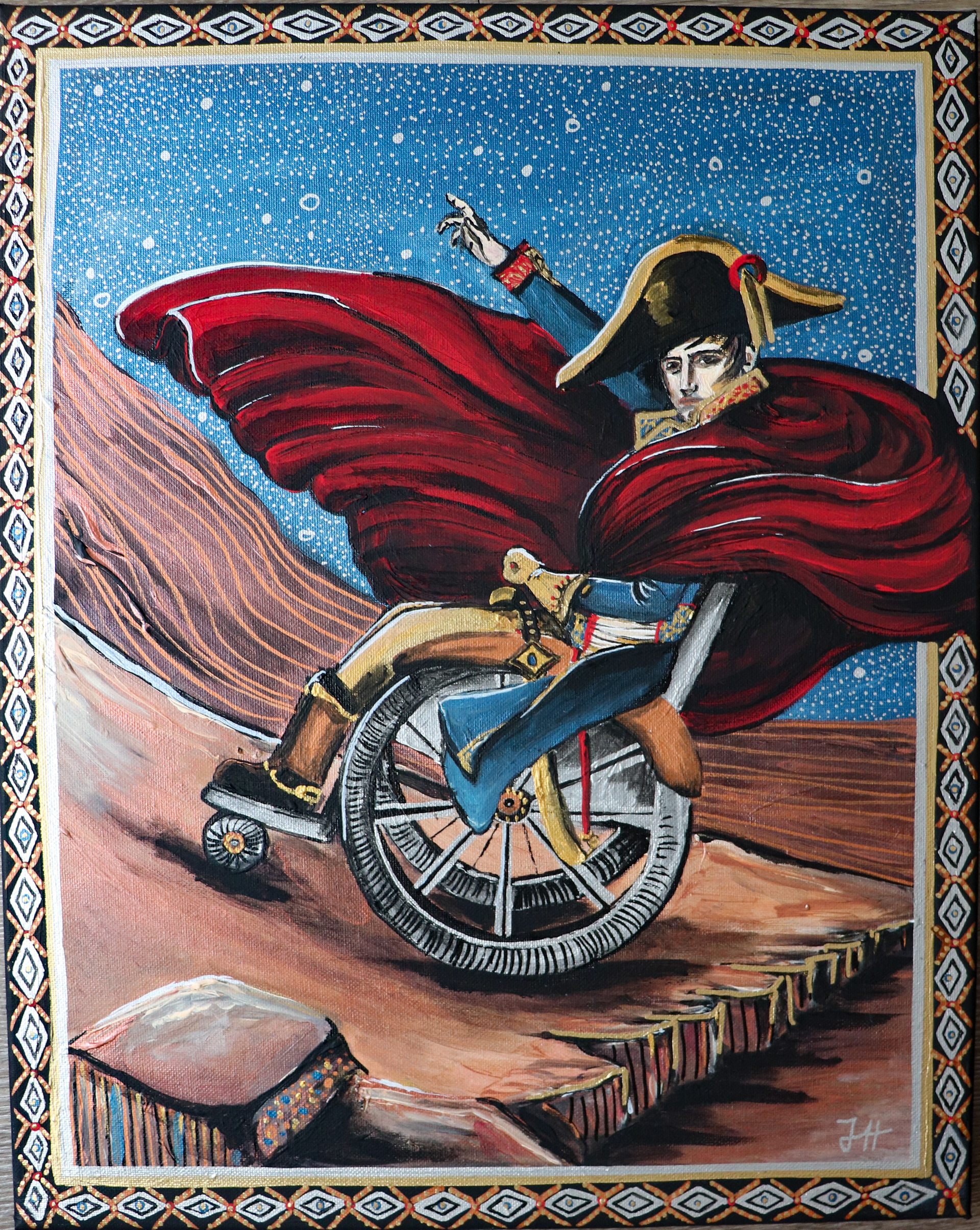 Napoleon Bonaparte in a wheelchair conqueres a rock. Acrylic on canvas. 40 x 50 cm.