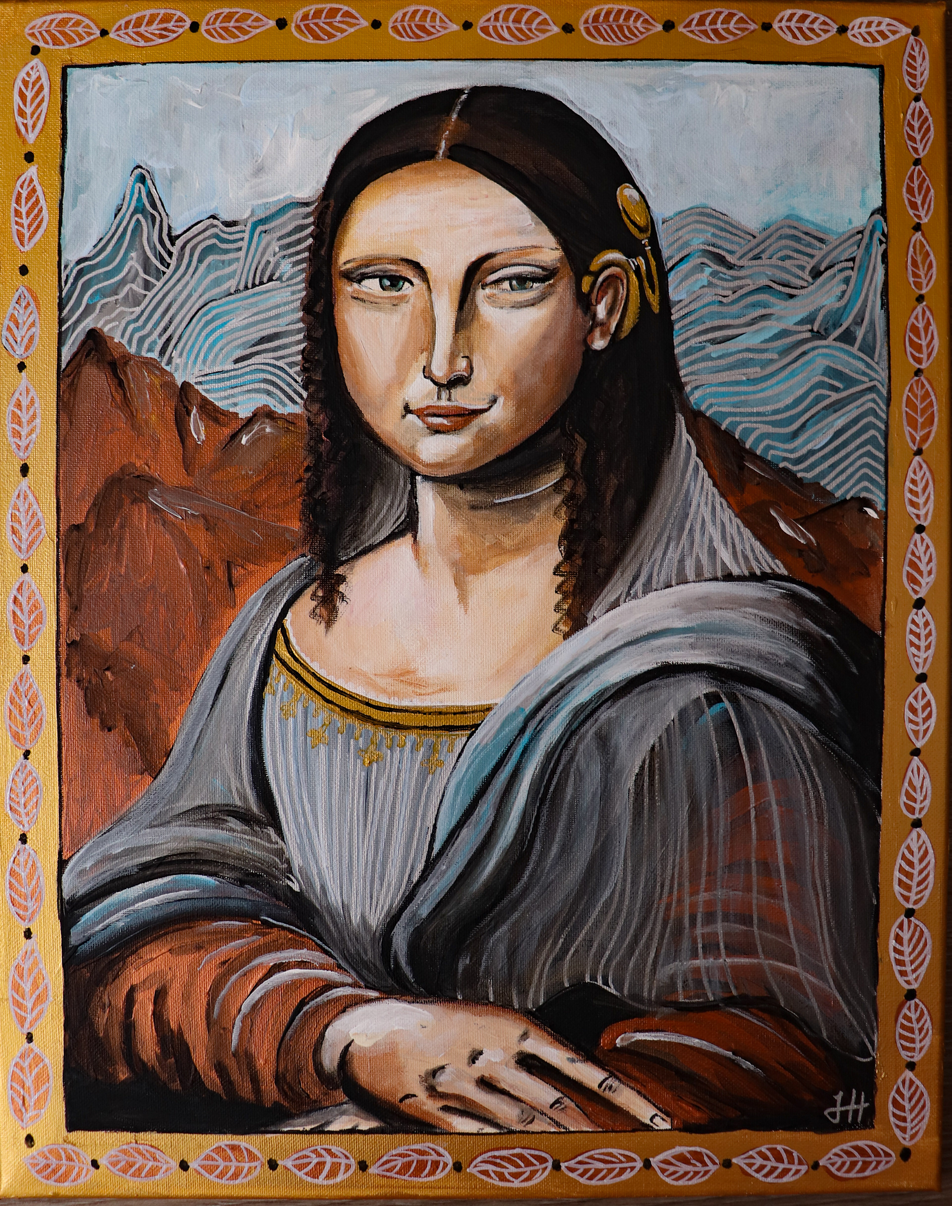 The most mysterious woman in the world in the Hirschfeld version with a golden cochlear implant. With acrylic on a 40 x 50 cm canvas.